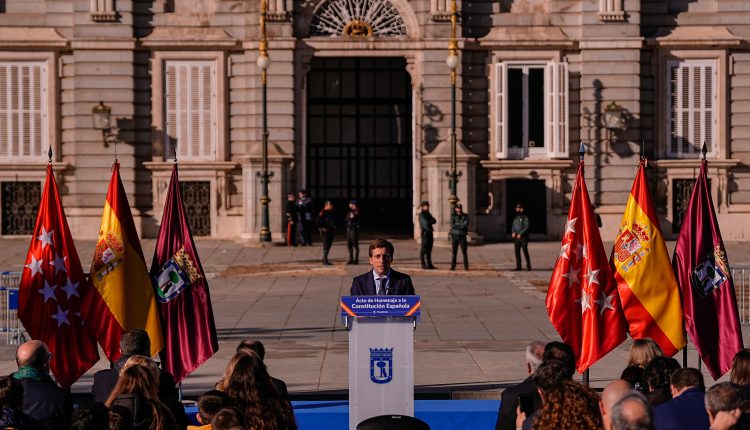 El alcalde de Madrid, José Luis Martínez-Almeida, ha presidido hoy el acto organizado por el Ayuntamiento con motivo del Día de la Constitución española en la plaza de Oriente, al que han asistido miembros del Gobierno municipal, portavoces de los grupos municipales y cronistas de la villa.