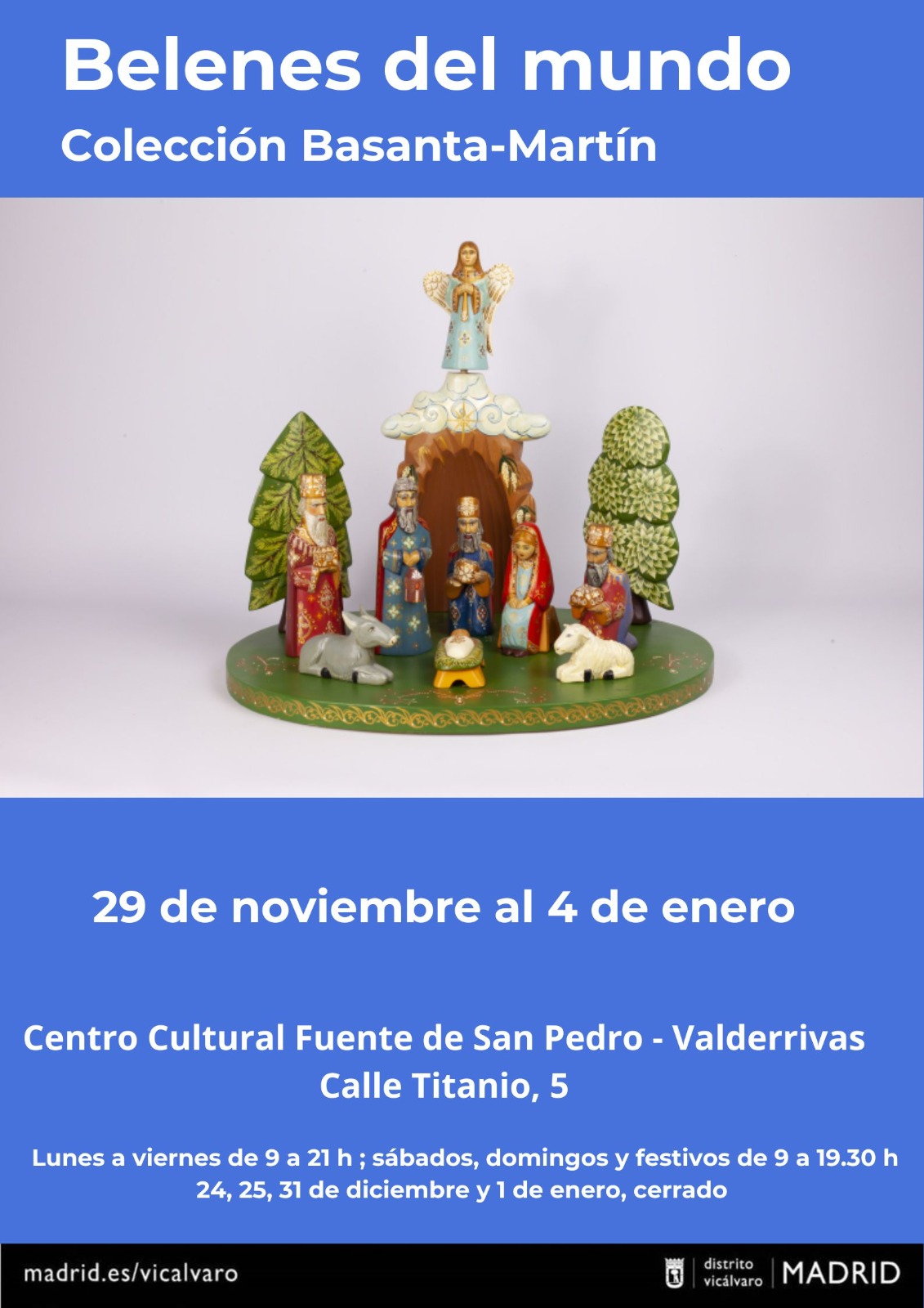 El Centro Cultural Fuente de San Pedro, en el distrito de Vicálvaro, presenta la exposición «Belenes del Mundo», una muestra de la Colección Basanta-Martín que estará disponible para el público del 29 de noviembre al 4 de enero.